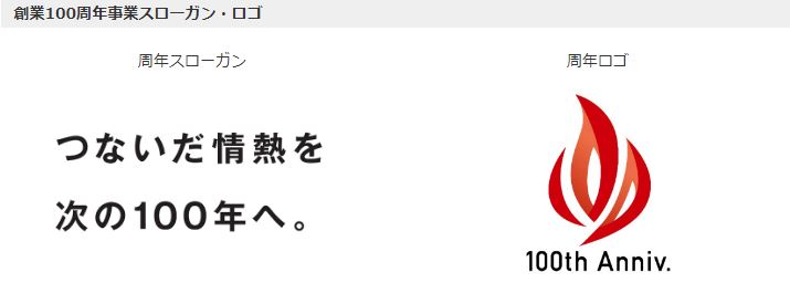また、周年事業期間中に各種ツールにて使用する周年ロゴを制定しました。このロゴは「象徴的な炎は、つないできた「100」年を表現。変わらない情熱の炎を胸に、これからの100年も歩み続ける。」という思いが込められたものです。